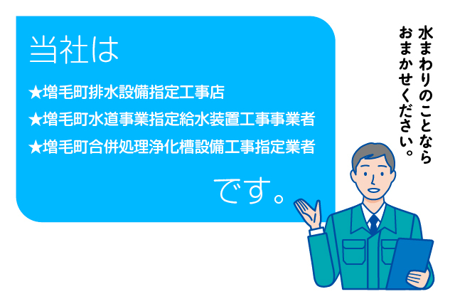 給排水、水洗トイレ、浄化槽、厨房、浴室、下水道排水、管工事、各種配管・設計・施工、水栓類他取付、水漏れ修理